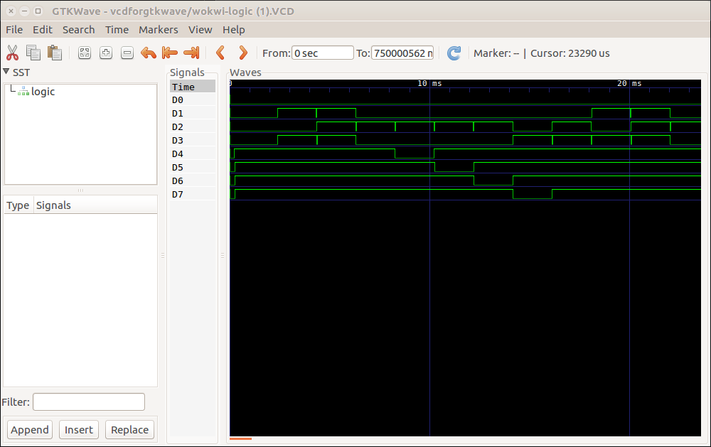 Nous allons automatiser l'affichage des chronogrammes contenus dans ce fichier pour cela, si vous ne l'avez pas déjà fait, ouvrir wokwi2gtkwave comme indiqué en haut de ce sujet.