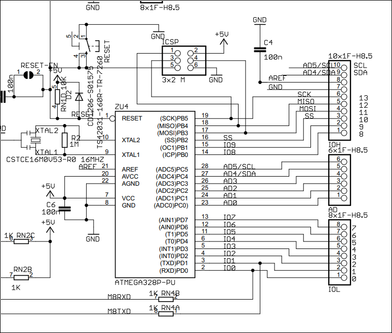 En plus de la numérotation des broches Arduino, vous devrez également relever la correspondance avec les broches du microcontrôleur ATMEGA328P. Les connecteurs IOL et IOH (avec la numérotation Arduino de 0 à 13) à droite sont respectivement pilotés par les registres PORTD et PORTB sur le schéma suivant: