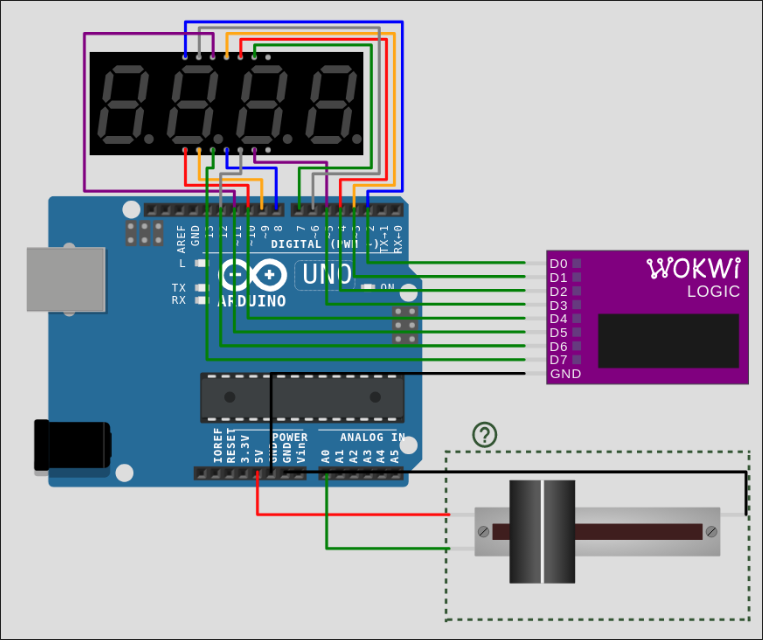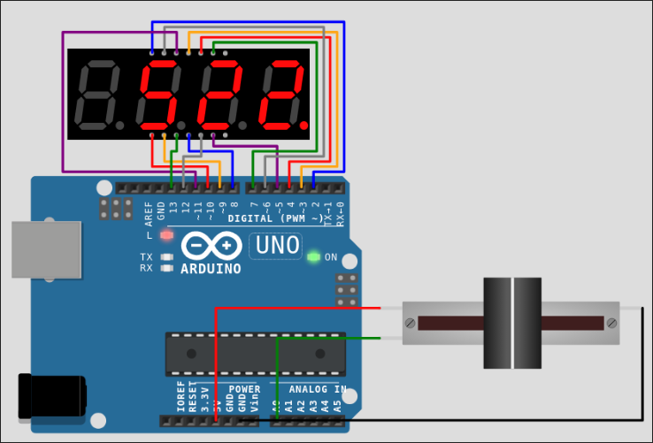 Adapter le code pour piloter l'affichage avec la valeur 10bits lue sur le Convertisseur Analogique Numérique via l'entrée A0. Ajouter également l'affichage sur la console de Debug de la valeur lue en décimal suivie d'un retour à la ligne. Vérifier en simulation le bon fonctionnement du système pour différentes positions du potentiomètre.