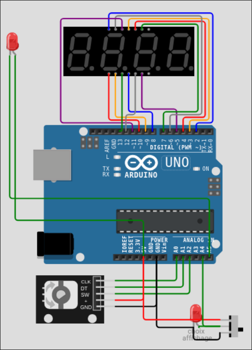 Sur ce schéma, vous retrouvez l'encodeur incrémental ainsi que l'afficheur 7 segments multiplexé à 4 digits. Une LED connectée à la sortie A5 de l'Arduino fait office de signe, en s'allumant pour indiquer le signe négatif. Un bouton de sélection connecté ) l'entrée A4 est utilisé pour permettre l'affichage soit de la position angulaire soit de la vitesse. L'affichage devra être actualisé cinq fois par seconde.
