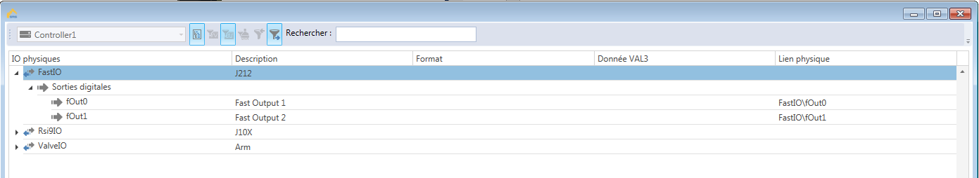 Dans la fenêtre Données, choisir tPince[0] et double cliquer en dessous de la colonne gripper pour ouvrir la configuration d'entrées sorties physiques comme visible sur l'image suivante: