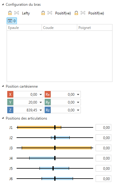 Cette partie de la fenêtre permet d'afficher et de choisir parmi les différentes configurations du robot quand plusieurs sont possibles (dans l'ordre épaule (shoulder), coude (elbow), poignet (wrist)). Elle affiche également la pose cartésienne du TCP par rapport au repère robot. Attention si vous réglez manuellement la position cartésienne à un valeur non atteignable, un minuscule panneau “Warning” apparaît à droite de “Position cartésienne”.
