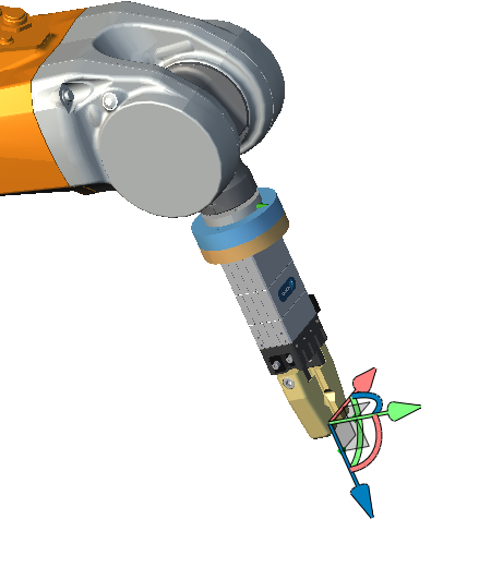Vous devriez voir la pince solidaire de la bride du robot, comme sur la figure suivante, dans laquelle le repère du haut est le handler du robot connecté au handle de la pince (sur la bride), alors que le repère du bas est le handler de la pince, situé au centre des mors: