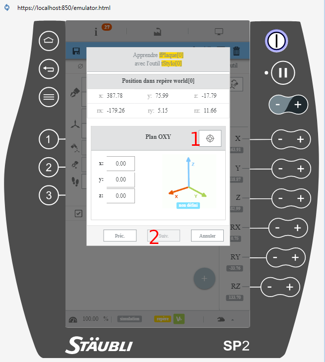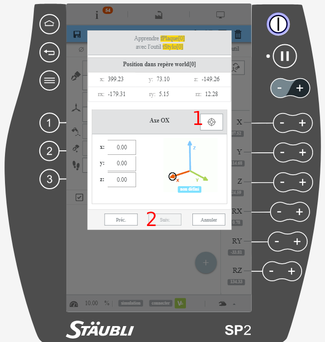 Déplacer l'outil dans la direction Ox du frame à apprendre, puis cliquer sur 1 puis 2 indiqués sur l'image suivante: