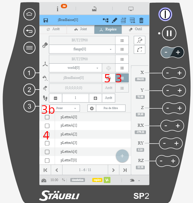 Documentation utilisation du pendant et repères: https://bvdp.inetdoc.net/files/iut/robotiqueBUT2/Utilisation_robot_indus_Staubli-Robotics_2020.pdf