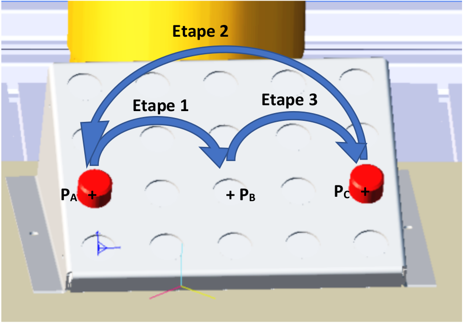 L'objectif est de déplacer de manière répétitive 2 pièces initialement placées en pA et pC sur une palette comme montré sur l'image suivante: