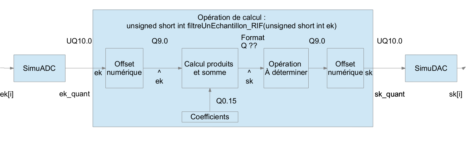 Vous allez maintenant implémenter le filtre avec les calculs en virgule fixe. Nous traiterons uniquement des filtres RIF car les filtres RII sont plus complexes à dimensionner.