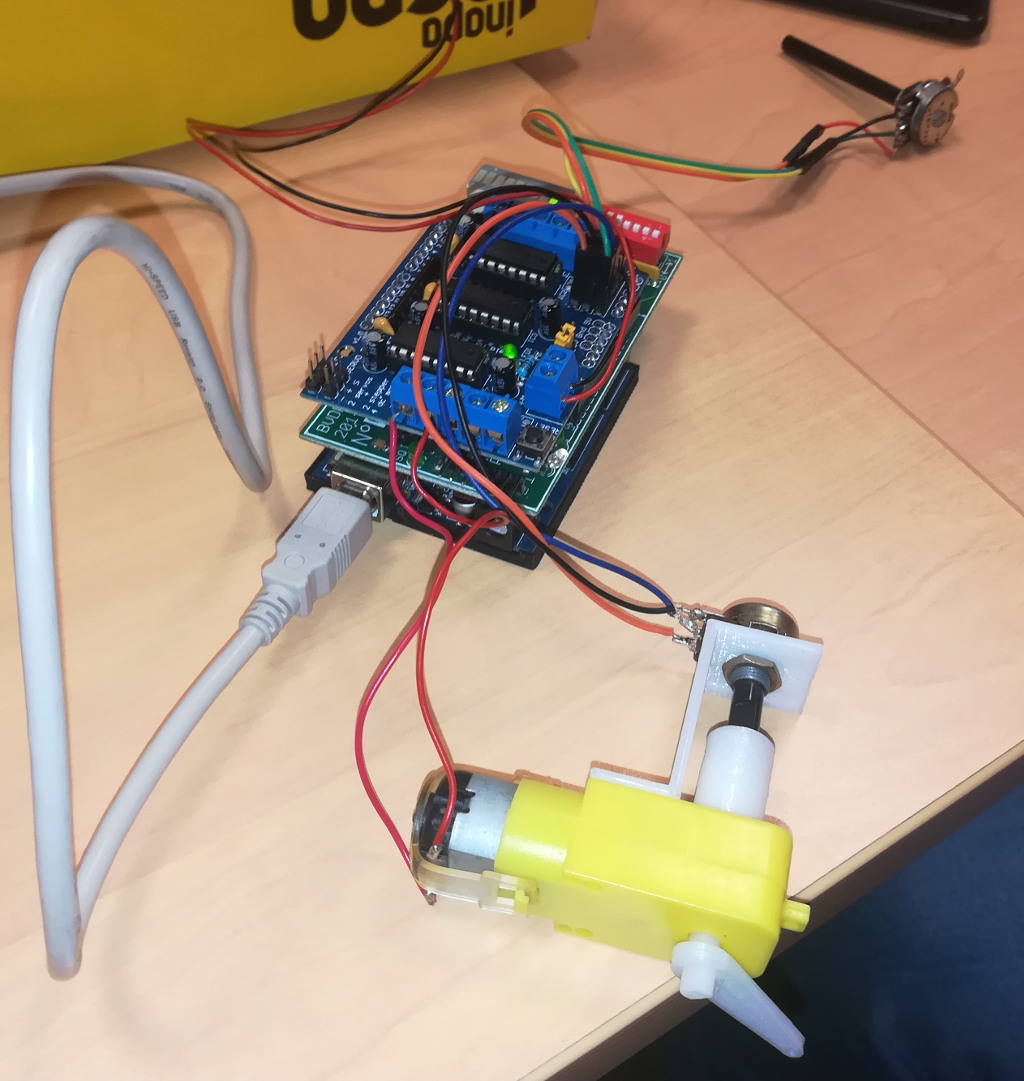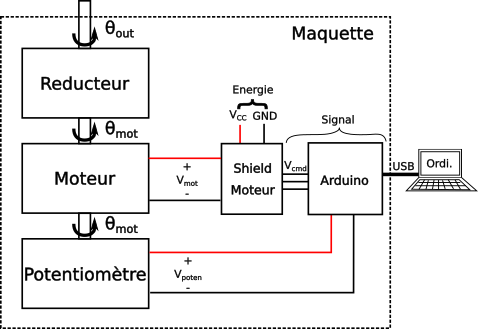 Vous pouvez remarquer une différence par rapport au modèle de servomoteur présenté. Notre maquette découpe la commande dans deux parties, l'Arduino+E/S et le shield moteur.