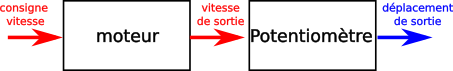 Si nous n'avons pas accès à la variable asservie, les choses sont plus compliqués. Ceci est le cas maintenant où nous souhaitons asservir un déplacement angulaire en agissant sur une vitesse angulaire. Cela s'exprime par le schéma indirect ci-dessous.