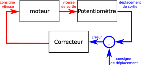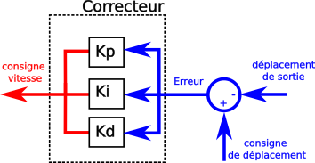 La difficulté est de trouver le moyen de “traduire” une consigne en déplacement dans une consigne en vitesse. Cette traduction est faite par un correcteur qui a pour but de minimiser l'erreur entre le déplacement de sortie et la consigne de déplacement. Cette “traduction” est illustrée par l'image ci-dessous.