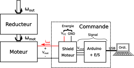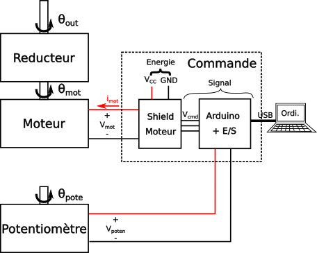 Le bloc Arduino+E/S reçoit la mesure du potentiomètre et génère des signaux de commande. Le shield du moteur reçoit les signaux de commande de l'Arduino et pilote la tension et le courant du moteur en fonction de ce signaux.