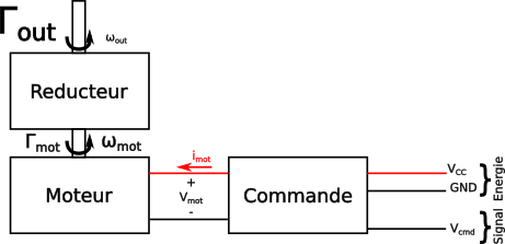 Le système appelé “commande” adapte la tension à l'entrée du moteur en fonction des signaux de commande qu'il reçoit. Il utilise une source d'énergie électrique extérieure dont la tension est constante et nommée VCC.