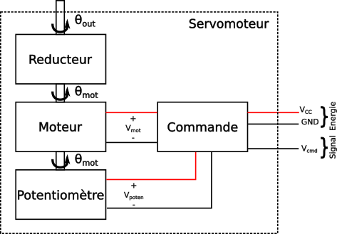 Un servomoteur est un moteur à courant continu dont le mouvement de rotation est contrôlé en termes d'angle plutôt qu'en vitesse. Le schématique ci-dessous illustre ce type de moteur :