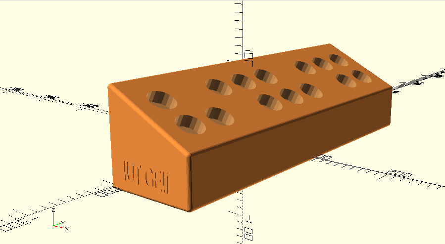 //B. Vandeportaele 2023 use <librepere.scad> eps=0.0001; resolution=20; //paramètre pour régler le niveau de détail du modèle rendu bords_arrondis=1; //1 pour sphere, 2 pour cylindre ///////////////////// module piece(jeu=0){ rotate([90,0,0]) translate([0,0,-10]) cylinder(h=20,r=15+jeu,$fn=resolution); } ///////////////////// module palette(){ rotate([90,0,0]) union(){ difference(){ minkowski(){ #linear_extrude(height = 400, center = true, convexity = 10, twist =0) polygon([[0,0],[100,0],[100,50],[0,100]], [[0,1,2,3]], convexity = 10); if (bords_arrondis==1){ sphere(r=4,$fn=resolution); } else { //rotate([90,0,0]) cylinder(r=4,h=1,$fn=resolution); } } translate([0,104,0]) rotate([0,0,atan2(-50,100)]) for (b =[1:2]){ for (a =[-4:4]){ echo(a+b*9); // affichage numéro pièce if (((a+b*9) % 4 )!=0){ translate([b*42-5,0,a*42]) //scale([20,20,20]) repere(); piece(0.5); } } } translate([0,104,0]) rotate([0,0,atan2(-50,100)]) hull(){ for (b =[1,2]){ for (a =[-4,4]){ echo(a+b*9); // affichage numéro pièce if (((a+b*9) % 4 )!=0){ translate([b*42-5,9,a*42]) //scale([20,20,20]) repere(); piece(0.5); } } } } } translate([15,10,205-eps]) scale([1.2,2.1,1]) linear_extrude(height = 10, center = true, convexity = 10, twist =0) text("IUT GEII"); } } //////////////////: palette();