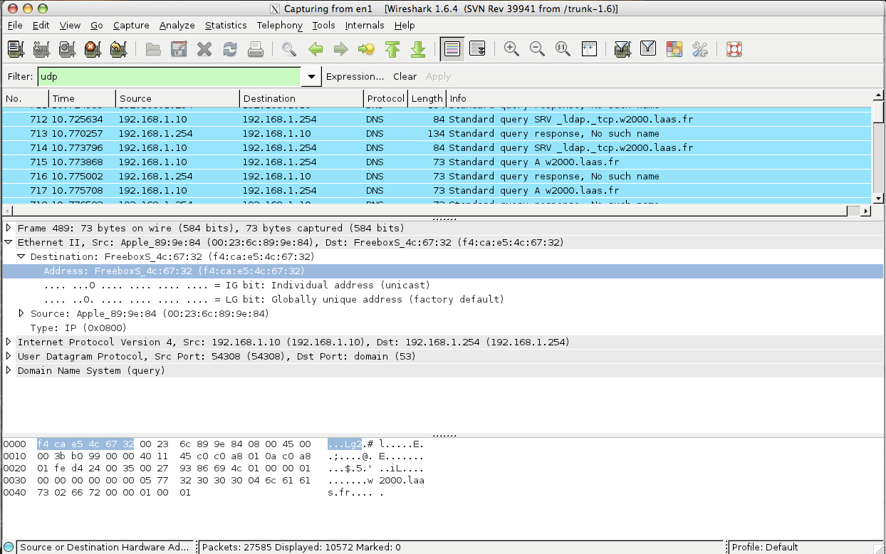 La figure suivante montre une capture d'écran de l'application. La trame n°489 est affichée. La couche Réseau est détaillée, notamment l'adresse MAC du destinataire de la trame. L'affichage de la valeur en hexadécimal est visible (zone sélectionnée dans la partie inférieure de la fenêtre).