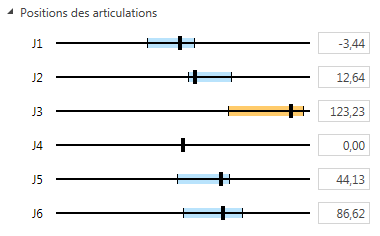 Cette partie de la fenêtre affiche (et permet de régler la position articulaire avec les curseurs épais déplaçables) l'angle en degrés correspondant à chaque articulation J1 à J6. Les plages articulaires (ré-initialisables à 0 avec l’icône croix rouge en haut de la fenêtre) sont affichées pour vérifier si le robot s'approche ou atteint des limites pendant l'exécution du programme.