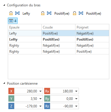 Cette partie de la fenêtre permet d'afficher et de choisir parmi les différentes configurations du robot quand plusieurs sont possibles (dans l'ordre épaule (shoulder), coude (elbow), poignet (wrist)). Elle affiche également la pose cartésienne du TCP par rapport au repère robot. Attention si vous réglez manuellement la position cartésienne à un valeur non atteignable, un minuscule panneau “Warning” apparaît à droite de “Position cartésienne”.