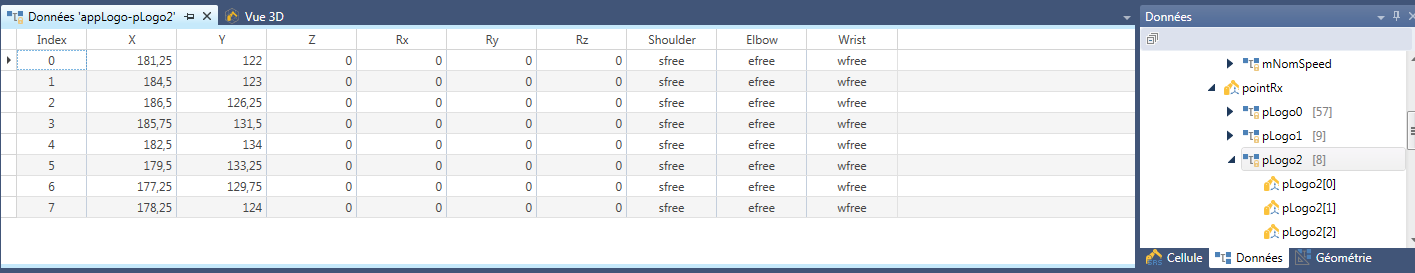 Cette fenêtre apparaît lorsque l'on fait double-clic sur une donnée (variable globale) dans la fenêtre Données. Elle est visible sur l'image d'exemple suivante et affiche une vue tabulaire de la variable sélectionnée (ici le tableau de points pLogo2 de l’application applLogo) avec chaque ligne du tableau correspondant à un indice et chaque colonne à un champ. Les noms des différents champs apparaissent en première ligne, et il peut être nécessaire de déplacer l’ascenseur horizontal pour les voir tous si la fenêtre n’est pas assez large.