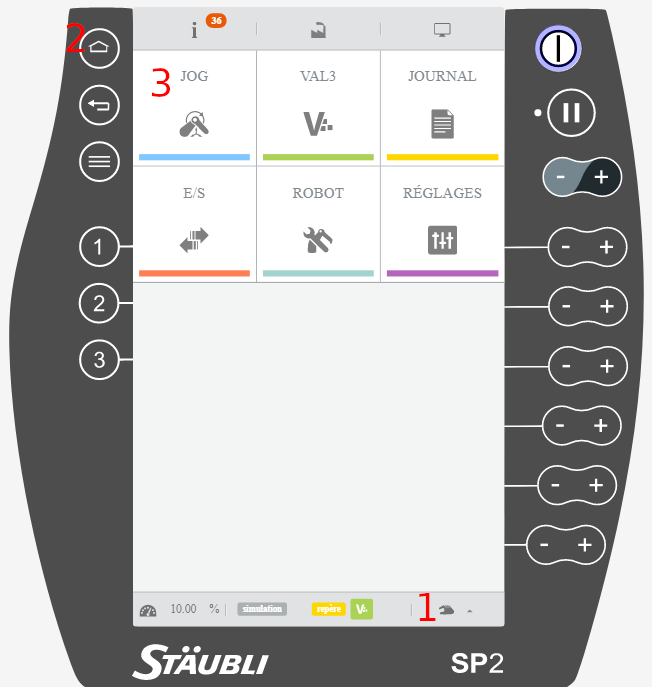 Différents onglets sont présents en haut de la fenêtre et font apparaître des fonctionnalités qu'il faudra aller chercher au moment opportun. Notez que certains réglages sont (des)activables et apparaissent bleutés lorsque activés (par exemple Déplacements articulaires et Déplacements cartésiens dans l'onglet Simulation ou bien les filtres de messages d'erreurs dans l'onglet Maintenance). Sachant ceci, vous pourrez réactiver des fonctionnalités si besoin.
