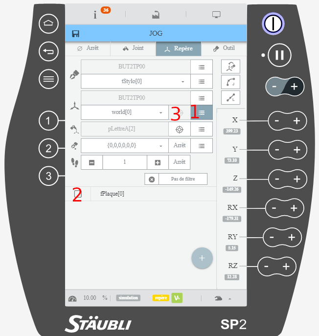 Documentation utilisation du pendant et repères: https://bvdp.inetdoc.net/files/iut/robotiqueBUT2/Utilisation_robot_indus_Staubli-Robotics_2020.pdf