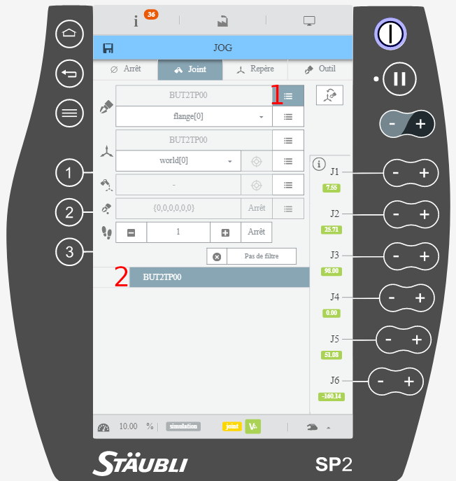Permet d'afficher/régler la pose du robot, en articulaire et en cartésien (en utilisant le TCP courant comme outil).