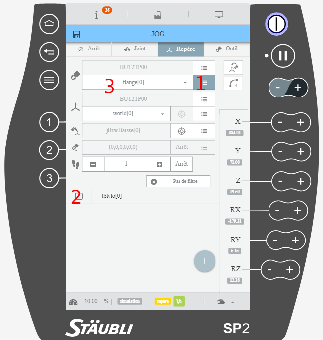 Vous pourrez donc piloter le robot en simulation de la même manière que le vrai robot en jouant sur l'interface du pendant, explorer les différents modes de fonctionnement, commander manuellement le robot, vous entraîner à apprendre des points et des repères etc.