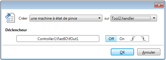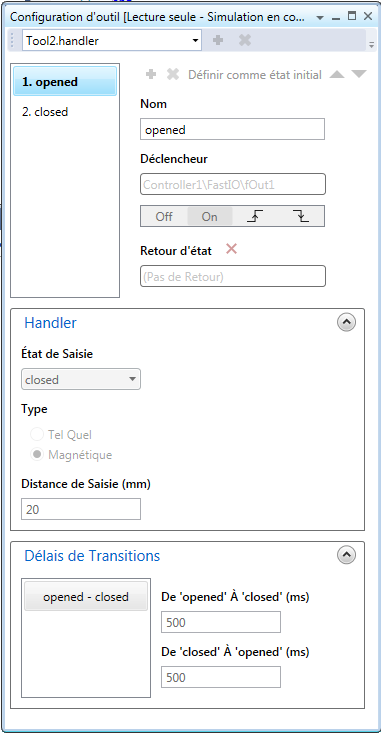 Pendant la simulation, il est possible d’observer la simulation de la pince en ouvrant la fenêtre: Accueil→Vue3D→État de la simulation. Ainsi, malgré que le modèle de la pince ne soit pas animé, vous pourrez savoir à chaque instant si elle est ouverte ou fermée dans la simulation.
