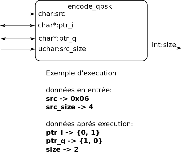 Le remplissage des fifos sera réalisé par la fonction int codage16QAM(char src, unsigned int size_src, char * pf_i, char * pf_q) que vous devez coder. Les données stockées dans chacune des 2 fifos seront des valeurs 0,1,2 ou 3.