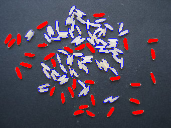 #B. Vandeportaele 29/01/2020 import numpy as np import cv2 #########################################" def mesureStats(cnt): #voir https://opencv-python-tutroals.readthedocs.io/en/latest/py_tutorials/py_imgproc/py_contours/py_contour_properties/py_contour_properties.html M = cv2.moments(cnt) area = cv2.contourArea(cnt) perimeter = cv2.arcLength(cnt,True) #x,y,w,h = cv2.boundingRect(cnt) #aspect_ratio = float(w)/h rect = cv2.minAreaRect(cnt) #print("rect:"+str(rect)) l=rect[1][1] m=rect[1][0] w=max(l,m) h=min(l,m) #print("w:"+str(w)) #print("h:"+str(h)) if h>0: aspect_ratio = float(w)/h else: aspect_ratio = 10000000 area = cv2.contourArea(cnt) hull = cv2.convexHull(cnt) hull_area = cv2.contourArea(hull) if hull_area>0: solidity = float(area)/hull_area else: solidity=1000000 return area,perimeter,aspect_ratio,solidity ######################################### def isGrainDeRiz(cnt): area,perimeter,aspect_ratio,solidity=mesureStats(cnt) #définir une condition permettant de segmenter les grains isolés par rapport aux amas if aspect_ratio>1.9 and area<200 and area>20 and solidity>0.8: return True else: return False #########################################" im = cv2.imread('riz.jpg') imgray = cv2.cvtColor(im,cv2.COLOR_BGR2GRAY) #seuil fixe -> nécessite un réglage manuel du seuil qui fait changer les résultats #ret,thresh = cv2.threshold(imgray,127,255,0) #le seuil qui semble optimal #ret,thresh = cv2.threshold(imgray,160,255,0) #seuillage otsu après filtre gaussien -> lisse trop #blur = cv2.GaussianBlur(imgray,(5,5),0) #ret3,thresh = cv2.threshold(blur,0,255,cv2.THRESH_BINARY+cv2.THRESH_OTSU) #seuillage otsu ret3,thresh = cv2.threshold(imgray,0,255,cv2.THRESH_BINARY+cv2.THRESH_OTSU) #kernel = np.ones((5,5),np.uint8) kernel = np.ones((3,3),np.uint8) thresh = cv2.erode(thresh,kernel,iterations = 2) thresh = cv2.dilate(thresh,kernel,iterations = 1) #thresh = cv2.morphologyEx(thresh, cv2.MORPH_OPEN, kernel,iterations = 1) cv2.imshow('image1',thresh) contours, hierarchy = cv2.findContours(thresh,cv2.RETR_TREE,cv2.CHAIN_APPROX_SIMPLE) #image, contours, hierarchy = cv2.findContours(thresh,cv2.RETR_TREE,cv2.CHAIN_APPROX_TC89_L1) #image, contours, hierarchy = cv2.findContours(thresh,cv2.RETR_TREE,cv2.CHAIN_APPROX_TC89_KCOS) cv2.imshow('image',imgray) cv2.imshow('image',thresh) img=im #affichage de tous les contours en vert #img = cv2.drawContours(im, contours, -1, (0,255,0), 1) #affichage du contours 4 en rouge #cnt = contours[4] #img = cv2.drawContours(img, [cnt], 0, (0,0,255), 1) #mesureStats(cnt) #cnt = contours[25] #img = cv2.drawContours(img, [cnt], 0, (255,0,0), 1) #mesureStats(cnt) Debug=False #mettre à True pour afficher les étapes du traitement #Debug=True methode=1 if methode==1: compteur=0 for i in range(0,len(contours)): #print(i) if isGrainDeRiz(contours[i]): compteur=compteur+1 #affiche les grains de riz isolé en rouge plein img = cv2.drawContours(img, [contours[i]], 0, (0,0,255), -1) else: #affiche les amas de grains de riz en bleu et uniquement les contours img = cv2.drawContours(img, [contours[i]], 0, (255,0,0), 1) if Debug: cv2.imshow('image',img) cv2.waitKey(0) cv2.destroyAllWindows() print(str(compteur)+ " grains de riz isolés trouvés") elif methode==2: #autre approche basée comparaison de forme, plus simple à implémenter mais moins bons résultats #https://opencv-python-tutroals.readthedocs.io/en/latest/py_tutorials/py_imgproc/py_contours/py_contours_more_functions/py_contours_more_functions.html compteur=0 for i in range(0,len(contours)): ret = cv2.matchShapes(contours[0],contours[i],1,0.0) if ret<0.8: compteur=compteur+1 #affiche les grains de riz isolé en rouge plein img = cv2.drawContours(img, [contours[i]], 0, (0,0,255), -1) else: #affiche les amas de grains de riz en bleu et uniquement les contours img = cv2.drawContours(img, [contours[i]], 0, (255,0,0), 1) if Debug: cv2.imshow('image',img) cv2.waitKey(0) cv2.destroyAllWindows() print(str(compteur)+ " grains de riz isolés trouvés") cv2.imwrite('riz_out.png',img) cv2.imshow('image',img) cv2.waitKey(0) cv2.destroyAllWindows()